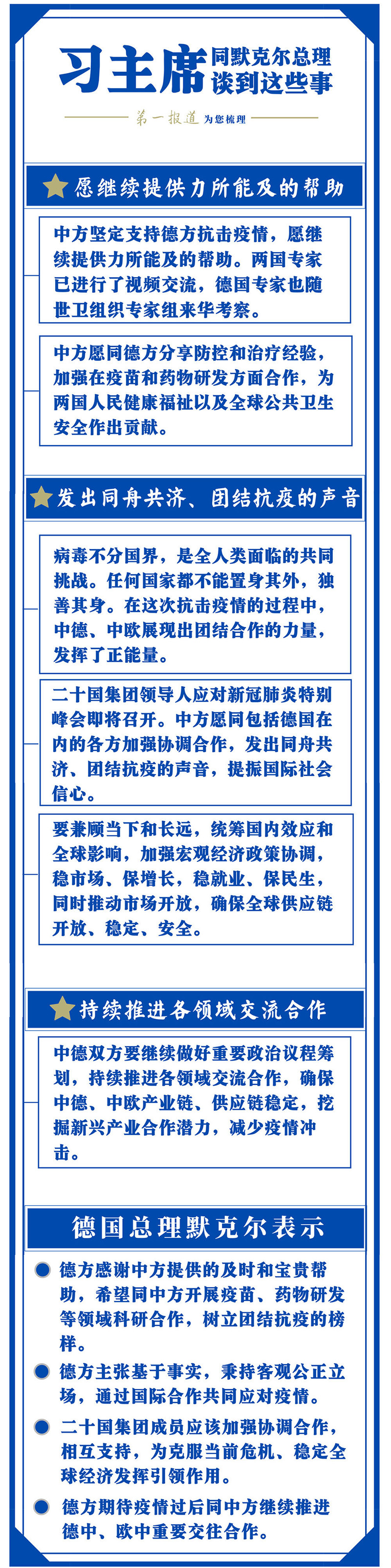 習近平指出,病毒不分國界,是全人類面臨的共同挑戰(zhàn)。任何國家都不能置身其外,獨善其身。在這次抗擊疫情的過程中,中德、中歐展現(xiàn)出團結合作的力量,發(fā)揮了正能量。二十國集團領導人應對新冠肺炎特別峰會即將召開。中方愿同包括德國在內的各方加強協(xié)調合作,發(fā)出同舟共濟、團結抗疫的聲音,提振國際社會信心。要兼顧當下和長遠,統(tǒng)籌國內效應和全球影響,加強宏觀經(jīng)濟政策協(xié)調,穩(wěn)市場、保增長,穩(wěn)就業(yè)、保民生,同時推動市場開放,確保全球供應鏈開放、穩(wěn)定、安全。