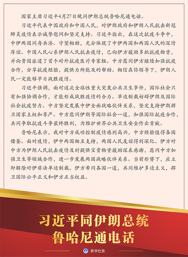 習(xí)近平代表中國政府和中國人民,對伊朗政府和伊朗人民抗擊新冠肺炎疫情表示誠摯慰問和堅定支持。習(xí)近平指出,在這次抗疫斗爭中,中伊兩國同舟共濟(jì)、守望相助,充分體現(xiàn)了中伊兩國和兩國人民的深情厚誼。中國人民心系伊朗人民抗擊疫情,已向伊方援助多批抗疫物資,并向貴國派遣了首個對外抗疫醫(yī)療專家組。中方愿同伊方繼續(xù)加強(qiáng)抗疫合作,分享抗疫經(jīng)驗,提供力所能及的幫助。相信在你領(lǐng)導(dǎo)下,伊朗人民一定能夠早日戰(zhàn)勝疫情。