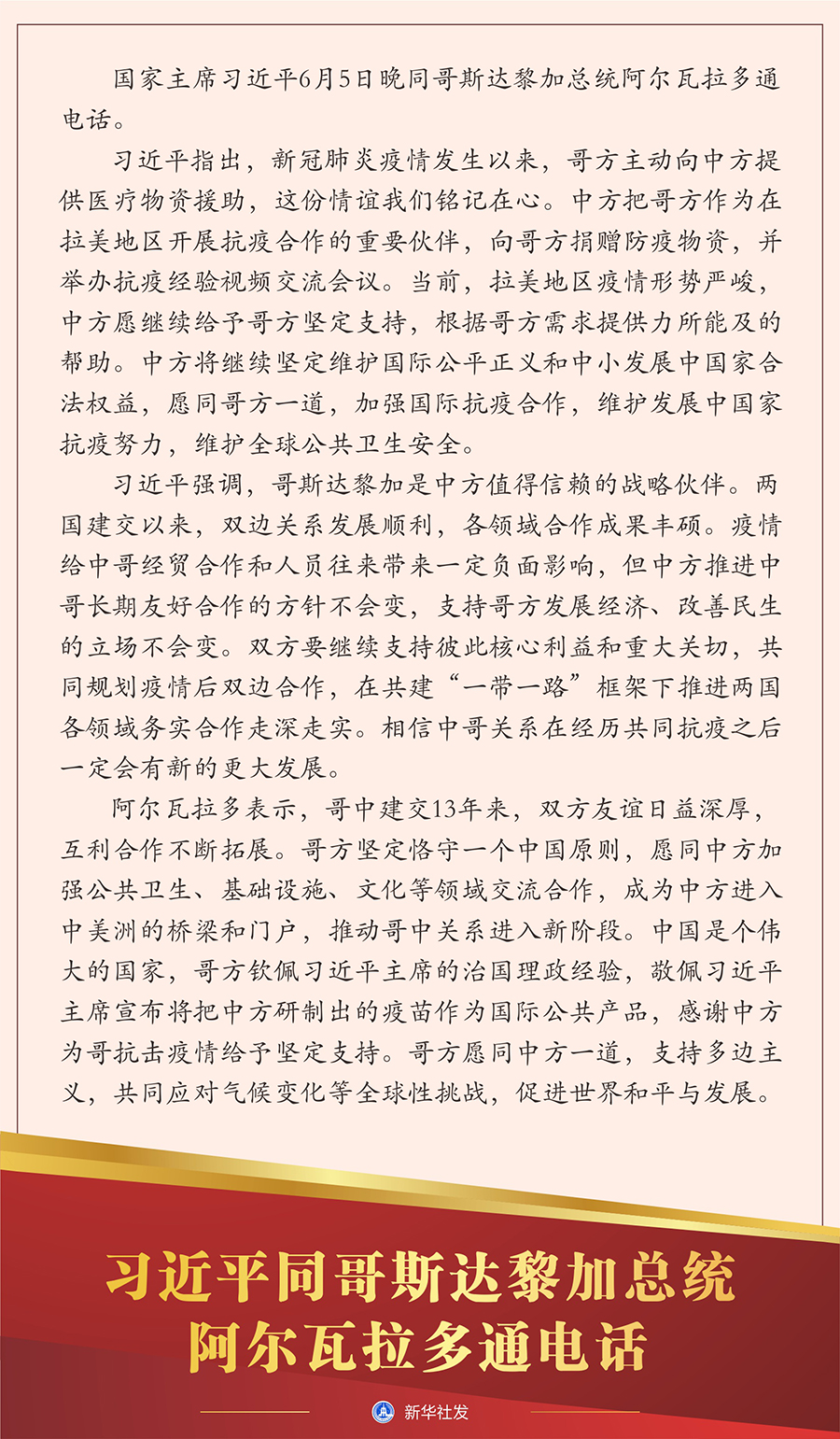 習(xí)近平指出,新冠肺炎疫情發(fā)生以來,哥方主動向中方提供醫(yī)療物資援助,這份情誼我們銘記在心。中方把哥方作為在拉美地區(qū)開展抗疫合作的重要伙伴,向哥方捐贈防疫物資,并舉辦抗疫經(jīng)驗視頻交流會議。當(dāng)前,拉美地區(qū)疫情形勢嚴(yán)峻,中方愿繼續(xù)給予哥方堅定支持,根據(jù)哥方需求提供力所能及的幫助。中方將繼續(xù)堅定維護(hù)國際公平正義和中小發(fā)展中國家合法權(quán)益,愿同哥方一道,加強(qiáng)國際抗疫合作,維護(hù)發(fā)展中國家抗疫努力,維護(hù)全球公共衛(wèi)生安全。