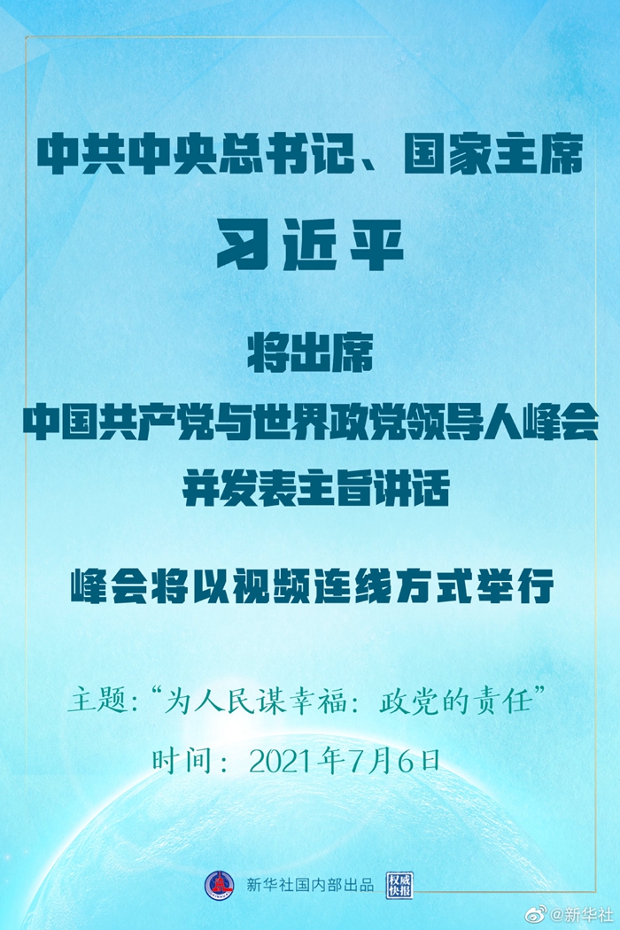 中共中央對外聯絡部發(fā)言人胡兆明5日宣布,中國共產黨與世界政黨領導人峰會將于7月6日以視頻連線方式舉行,中共中央總書記、國家主席習近平將在北京出席會議并發(fā)表主旨講話。此次會議的主題為“為人民謀幸福:政黨的責任”,160多個國家的500多位政黨和政治組織等領導人以及逾萬名政黨代表等將出席會議。