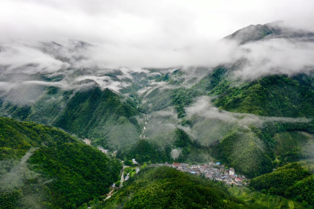 這是2021年5月18日拍攝的武夷山國(guó)家公園腹地的原始森林與村落(無(wú)人機(jī)照片)。新華社記者 姜克紅 攝