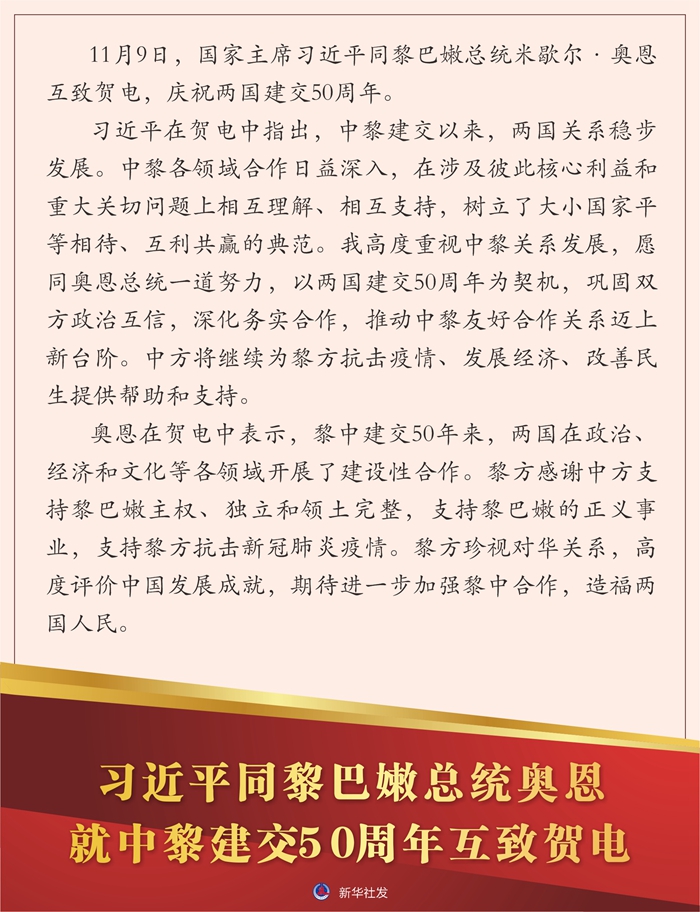 習(xí)近平在賀電中指出,中黎建交以來,兩國關(guān)系穩(wěn)步發(fā)展。中黎各領(lǐng)域合作日益深入,在涉及彼此核心利益和重大關(guān)切問題上相互理解、相互支持,樹立了大小國家平等相待、互利共贏的典范。我高度重視中黎關(guān)系發(fā)展,愿同奧恩總統(tǒng)一道努力,以兩國建交50周年為契機(jī),鞏固雙方政治互信,深化務(wù)實(shí)合作,推動(dòng)中黎友好合作關(guān)系邁上新臺(tái)階。中方將繼續(xù)為黎方抗擊疫情、發(fā)展經(jīng)濟(jì)、改善民生提供幫助和支持。