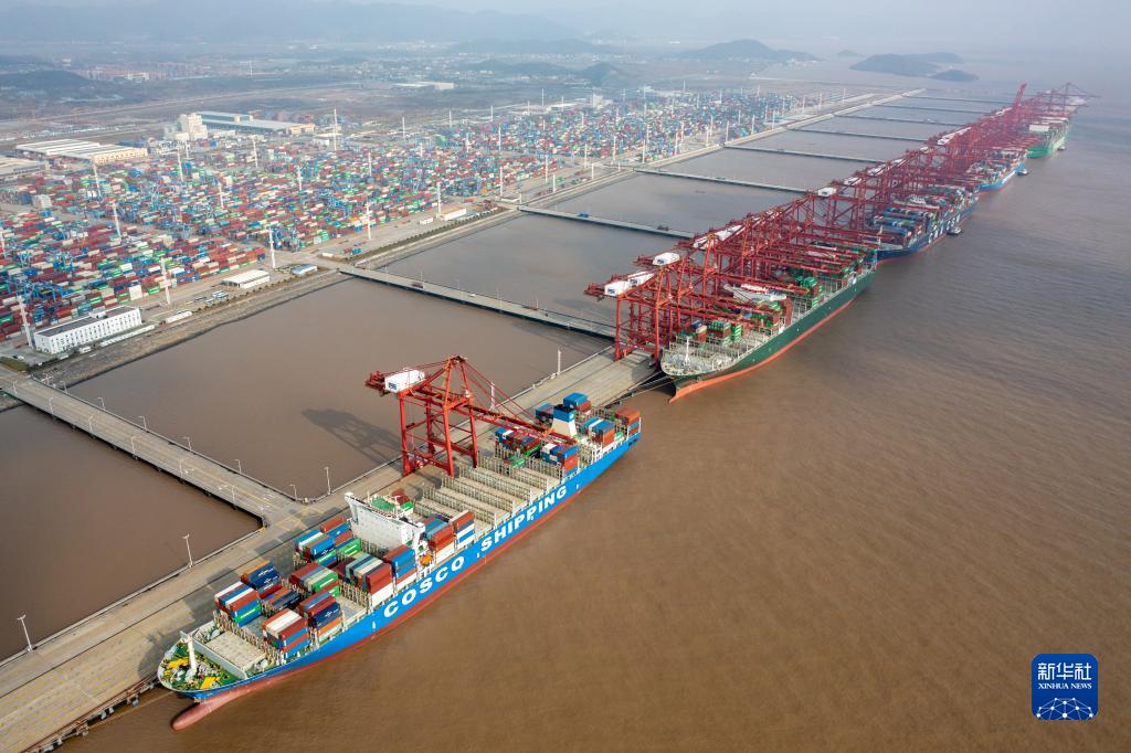 浙江寧波舟山港梅山港區(qū)集裝箱碼頭一派繁忙(2021年12月17日攝,無人機(jī)照片)。新華社發(fā)(蔣曉東 攝)