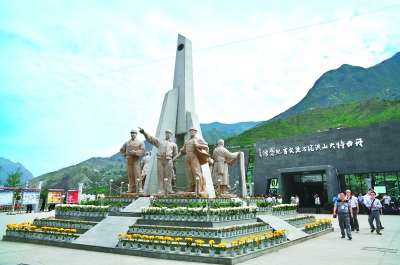 舟曲特大山洪泥石流災(zāi)害紀(jì)念館位于舟曲“8·8”特大山洪泥石流災(zāi)害災(zāi)情最為嚴(yán)重的三眼峪沖擊口與白龍江堰塞湖的交匯處,位于館前的石雕濃縮著搶險救災(zāi)、災(zāi)后重建和舟曲人民的感恩奮進(jìn)等動人場景。