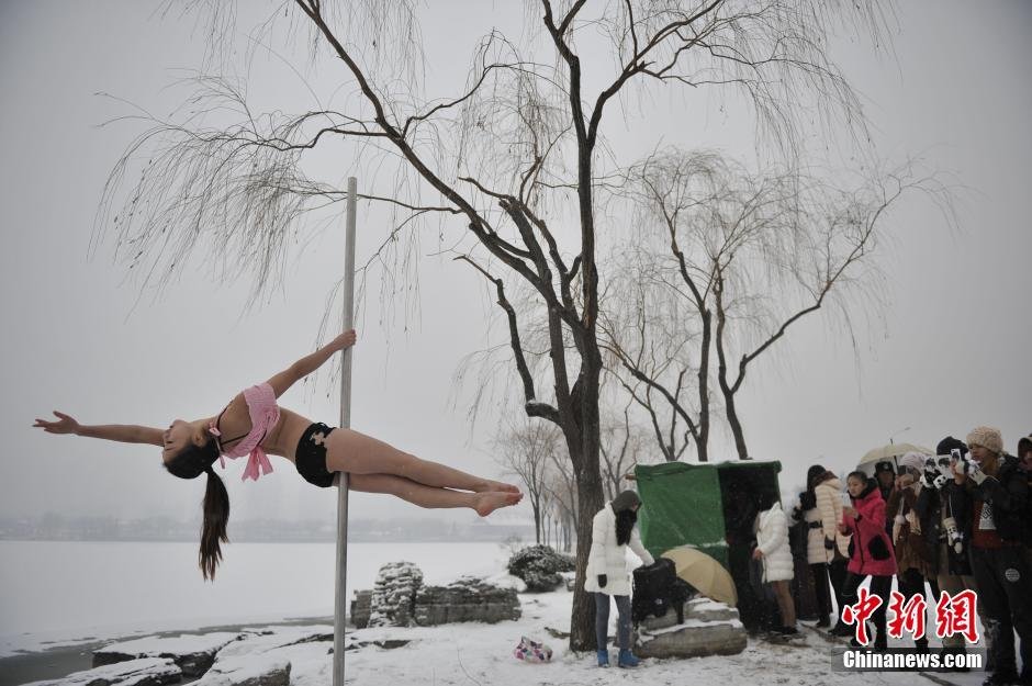 12月17日,中國鋼管舞國家隊隊員帶領(lǐng)著中國鋼管舞運動訓(xùn)中心的學(xué)員們來到天津水上公園內(nèi)繡技藝,引來市民的關(guān)注。當(dāng)日,天津迎來入冬的第一場雪。中新社發(fā) 佟郁 攝