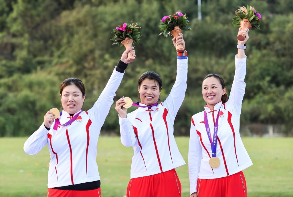 10月1日,中國(guó)選手李清念(右)、武翠翠(左)、張?chǎng)吻镌陬C獎(jiǎng)儀式上。新華社記者 單宇琦 攝