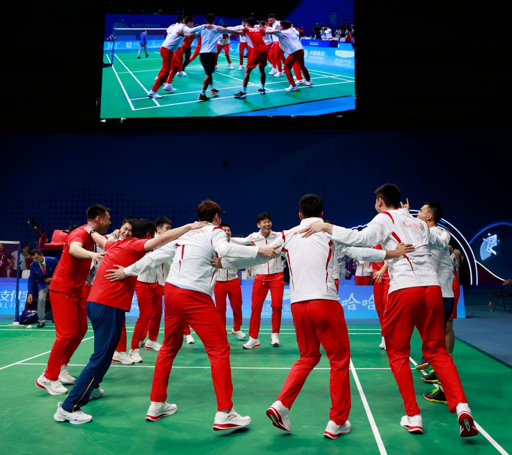 10月1日,中國(guó)羽毛球隊(duì)在獲勝后慶祝。新華社記者 任正來(lái) 攝