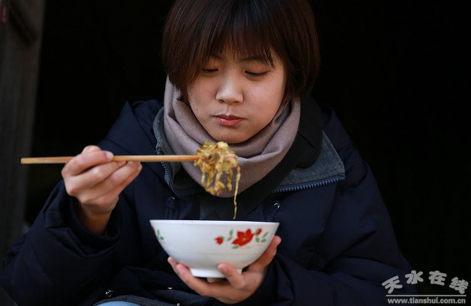 在古老的天水,每當(dāng)冬季來(lái)臨,氣溫一天天下降,時(shí)不時(shí)的有陣陣?yán)淇諝鈦?lái)襲,在寒冷的日子里,一碗熱乎乎的馓面飯便成為驅(qū)寒暖身的最美佳肴。做馓面飯是一門藝術(shù)。以當(dāng)年的新鮮玉米,用石磨磨成的面最香。做時(shí),先用大火將鐵鍋里的水燒開,然后放進(jìn)大塊的土豆塊,右手執(zhí)一長(zhǎng)竹筷,左手抓適量玉米面邊往鍋里拋灑,一邊灑一邊用竹筷勻速攪動(dòng),這時(shí)候雙手一定要配合默契,要不然面在鍋里會(huì)結(jié)成疙瘩,待到稀稠適當(dāng),鍋里形成糊狀時(shí),核桃般大的氣泡從鍋里“撲哧撲哧”地往出冒,再用大勺來(lái)回?cái)嚢,這時(shí)蓋上鍋蓋,用細(xì)火慢燉少許時(shí)間,一鍋香蓬蓬、伴著新鮮玉米面和土豆特殊香味的馓面飯便出鍋了。 馓飯做熟后,還得有下飯吃的菜,天水人叫“下”菜。“下”菜的種類很多,多可數(shù)十種,少則一兩種,最常見的是炒青椒、炒土豆絲、涼拌胡蘿卜絲、涼拌蘿卜、熗酸菜和各種腌制的泡菜。在麥積區(qū)和清水縣,還有一種特別的“下”菜——“麻菜”,因這里盛產(chǎn)花椒,每年霜降之后,家家將經(jīng)過(guò)霜浸過(guò)的大白菜和卷心菜放在大鍋里過(guò)水后晾涼,一層一層碼在缸中,灑上食鹽和花椒粒,缸口用大小適宜的石頭鎮(zhèn)壓發(fā)酵成熟。一月之后,清脆可口、帶著濃郁椒香味的“麻菜”便制成了,“麻菜炒豆腐”是吃馓飯最好的“下”菜。過(guò)去,農(nóng)村生活條件差,冬天的新鮮蔬菜少,一缸“麻菜”就是一家人整個(gè)冬天的菜壇子。雨雪天,端上一碗熱乎乎的馓飯,一家人圍坐在炕頭,外面天寒地凍,屋內(nèi)卻熱氣騰騰,溫暖從捂著馓飯碗的手漸漸融化到心里,是多么溫馨的事!吃馓飯也很講究,要從碗邊或中間一筷一筷地?fù)破,手中的碗要不斷的旋轉(zhuǎn),吃到碗底馓飯都是熱乎乎的,而且吃過(guò)的碗特別干凈。外地人不會(huì)吃,嫌這樣太麻煩,干脆端起來(lái)一喝了之,這可是吃馓飯的大忌,是最煞風(fēng)景的。