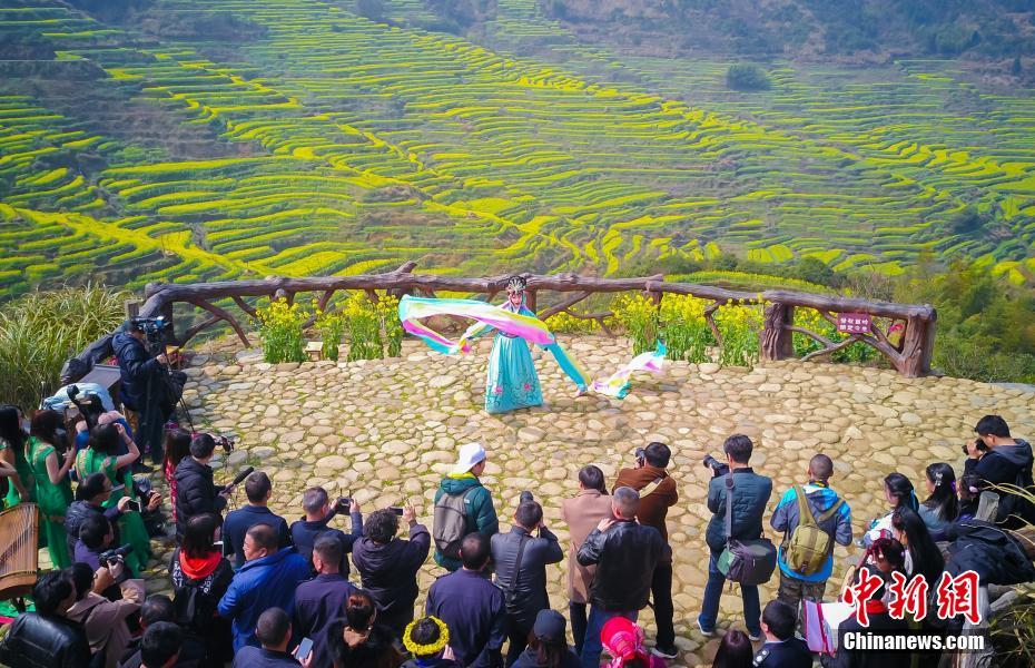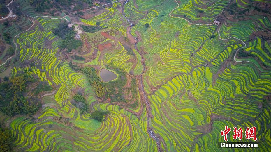 近日,“最美鄉(xiāng)村”江西婺源篁嶺萬(wàn)畝油菜花進(jìn)入盛花期。3月8日,航拍梯田花海美景。方華彬 攝