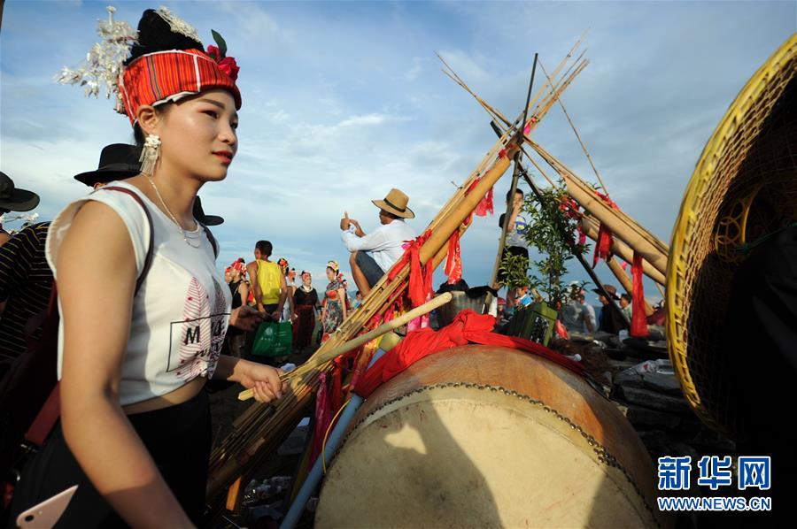 8月4日,在劍河縣岑松鎮(zhèn)巫門村,一名苗族姑娘在“祈雨節(jié)”上擊鼓。新華社發(fā)(楊文斌 攝)
