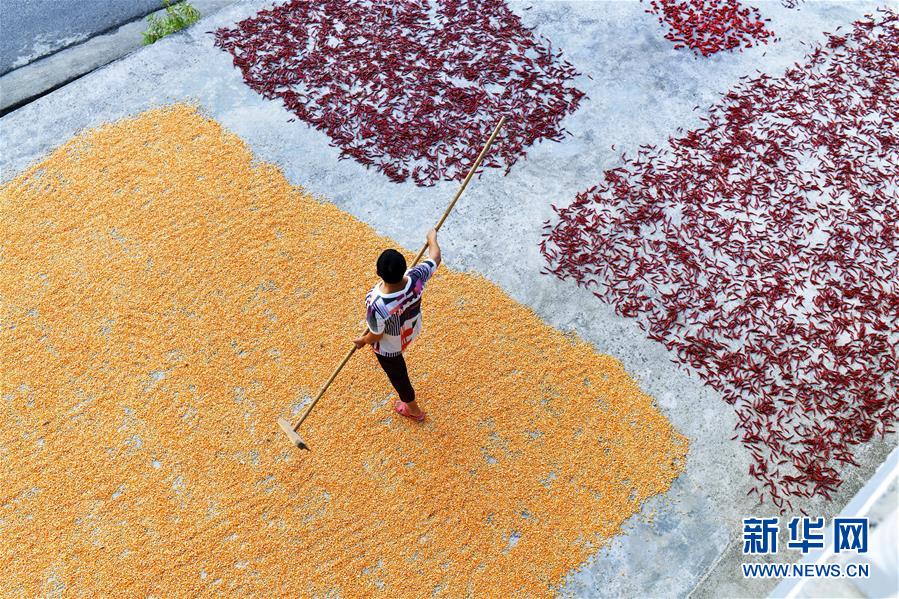 8月26日,貴州省遵義市鳳岡縣土溪鎮(zhèn)石橋村村民在晾曬玉米和紅辣椒。眼下,在貴州省遵義市各地農(nóng)村,村民們把收獲的紅辣椒、玉米等鋪放在房前屋后進(jìn)行晾曬,構(gòu)成一幅幅美麗的“曬秋圖”。新華社發(fā)(羅星漢 攝)