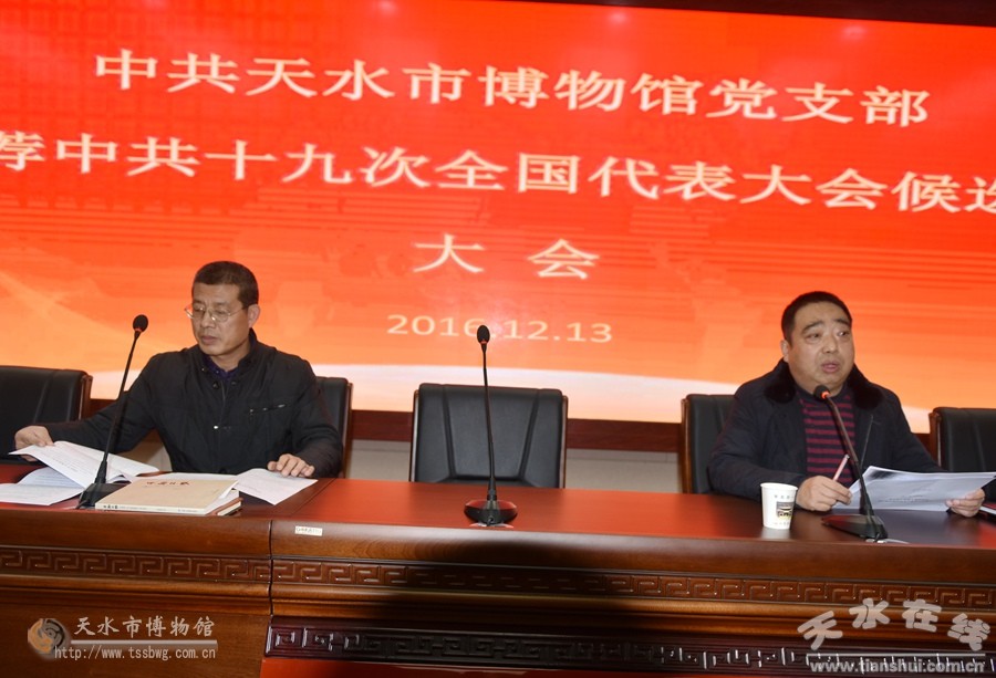 12月13日,天水市博物館在明道堂召開中共天水市博物館黨支部推薦中共十九次全國代表大會候選人大會。副館長管玉、汪保全和各部室主任、黨員共38人參加了會議。會議選舉劉復(fù)興同志為中共天水市博物館黨支部推薦的中共十九次全國代表大會候選人初步人選。