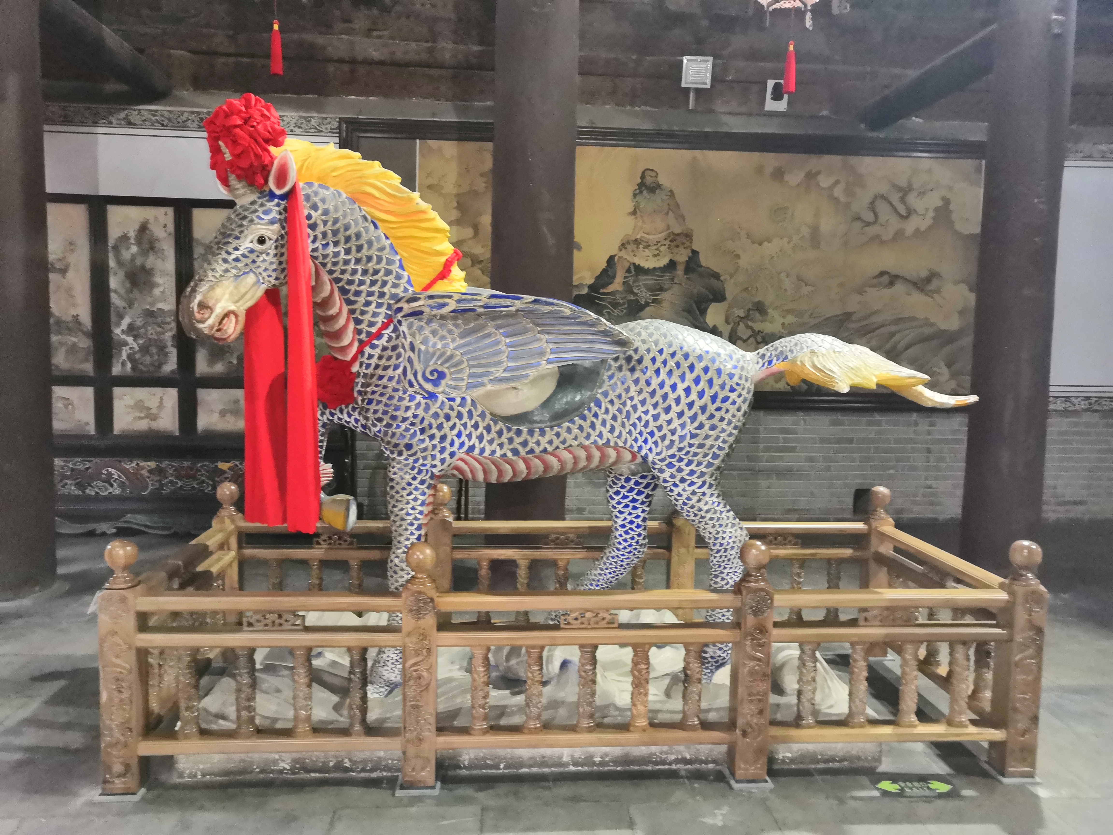 圍欄用于保護(hù)伏羲廟先天殿龍馬。龍馬是中國古代神話中的形象,河中精靈,傳說是一種長(zhǎng)雙翅與魚尾,有龍鱗的神馬。漢代《尚書中候·握河紀(jì)》說:“伏羲氏有天下,龍馬負(fù)圖出于河,”伏羲見河圖創(chuàng)出八卦。天水當(dāng)?shù)匕傩崭心罘说墓Φ,在先天殿彩塑一座威武雄壯、踏浪而行的龍馬像,龍馬像已成為伏羲廟的吉祥圣物。新制作的龍馬塑像圍欄長(zhǎng)3.2米,寬1.3米,高0.68米,厚重典雅,制作精美,選用天水核桃木,木材堅(jiān)硬,紋理樸素。圍欄由8根長(zhǎng)方柱和36根圓柱組成,柱身均雕刻龍紋,寓意中華民族是龍的傳人,伏羲是龍祖,伏羲廟是龍廟。長(zhǎng)方柱柱頭有“八球望天”,多處雕有團(tuán)云、蓮子、四海水紋等傳統(tǒng)吉祥圖案。柱下放石墩,隔絕濕氣。