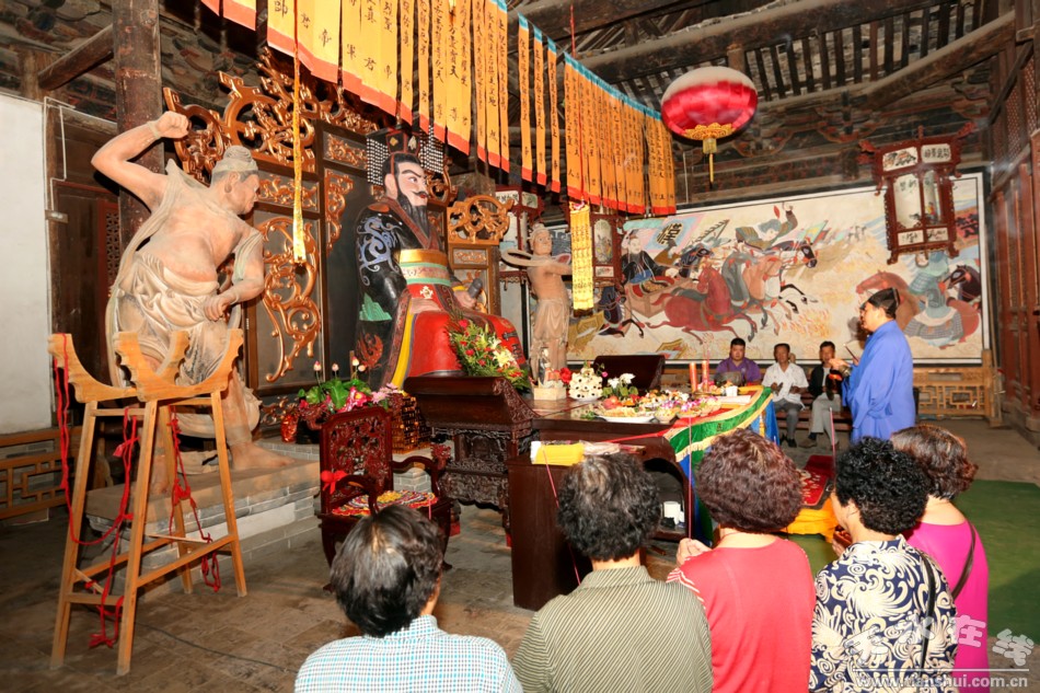 21日下午2時(shí)由秦腔表演與誦經(jīng)儀組成的祭祀活動(dòng)開(kāi)始,秦腔表演是由國(guó)家一級(jí)演員,有中國(guó)秦腔四小名旦之稱的袁丫丫領(lǐng)銜的,其俊美的扮相,高亢圓潤(rùn)的嗓音,細(xì)膩的表演風(fēng)格使臺(tái)下觀眾頗為稱贊。同時(shí)殿前的道士們也開(kāi)始了誦經(jīng)儀式,莊嚴(yán)肅穆,不時(shí)有虔誠(chéng)的香客下跪叩首祈福。隨著時(shí)間的推移,越來(lái)越多的香客、戲迷也絡(luò)繹不絕的進(jìn)入祠內(nèi),氣氛也越來(lái)越熱鬧起來(lái)。