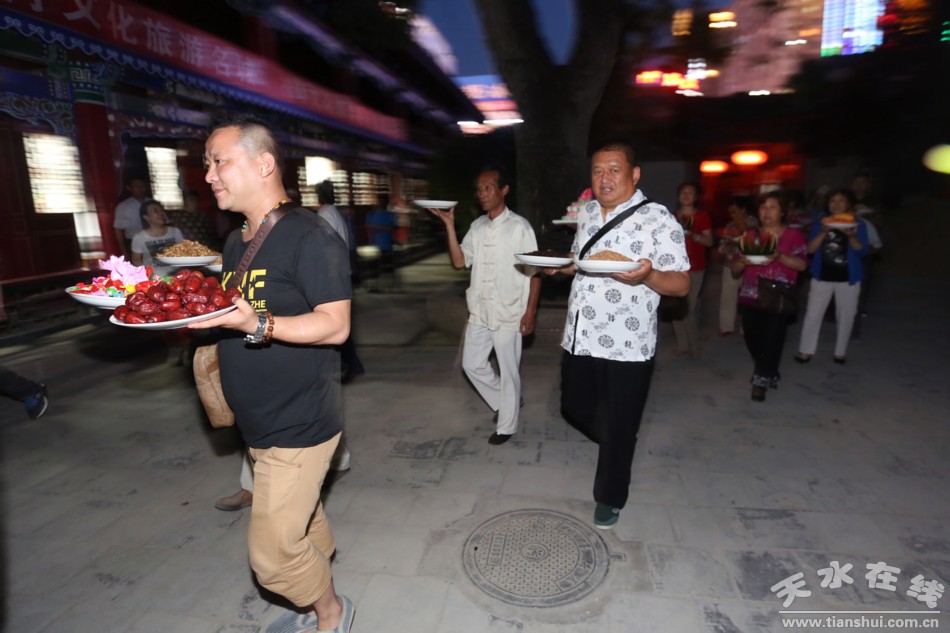 0時(shí),隨著恭祭人宣布,公元2016丙申年農(nóng)歷五月十八日天水城隍祭祀典禮正式開(kāi)始。鼓樂(lè)齊名,鑼鼓喧天,恭祭人讀祭文、上香、獻(xiàn)花、祭酒、奉茶……一樣樣祭品高高的舉過(guò)頭頂,有條不紊的送進(jìn)大殿內(nèi)的貢桌上,人們的虔誠(chéng)之心溢于言表。獻(xiàn)貢完畢,所有香客面向城隍像齊齊下跪叩首,祈福來(lái)年國(guó)泰民安,風(fēng)調(diào)雨順。