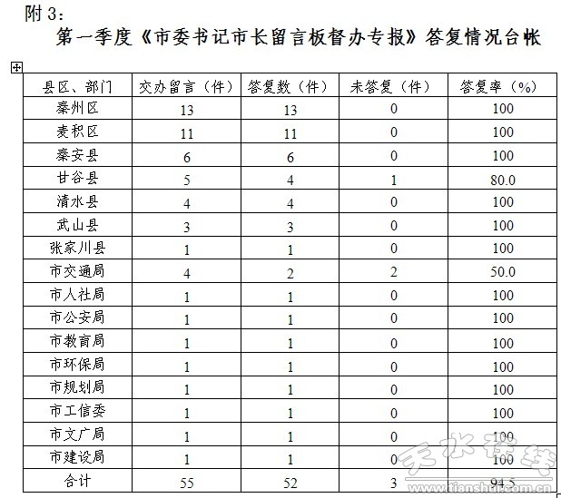 為了認真做好網(wǎng)民留言辦理工作,提高網(wǎng)民留言辦理效率,逐步健全督促辦理長效機制,使“留言板”網(wǎng)絡(luò)問政工作逐步實現(xiàn)制度化、規(guī)范化、常態(tài)化,根據(jù)《天水市市委書記市長留言板辦理工作規(guī)定》的規(guī)定,投訴中心2012年5月專門發(fā)文要求各縣區(qū)、市直部門、單位每月都要將網(wǎng)民留言辦理落實及答復(fù)情況上報投訴中心進行匯總統(tǒng)計。從今年1-3月報表的報送情況來看,每月及時報送的縣區(qū)、部門、單位有:麥積區(qū)政府、秦州區(qū)政府、秦安縣政府、武山縣政府、張家川縣政府、市教育局、市招商局、市環(huán)保局、市農(nóng)業(yè)局、市藥監(jiān)局、市工商局、羲通公交公司等。網(wǎng)民留言多、信息量大未及時統(tǒng)計報送的縣有:清水縣政府、甘谷縣政府。