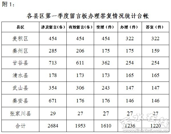 附:1、各縣區(qū)第一季度留言板辦理情況統(tǒng)計臺帳