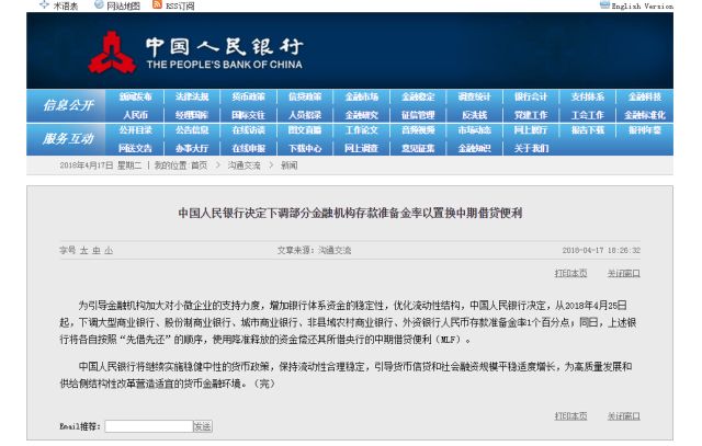 為引導(dǎo)金融機(jī)構(gòu)加大對(duì)小微企業(yè)的支持力度,增加銀行體系資金的穩(wěn)定性,優(yōu)化流動(dòng)性結(jié)構(gòu),中國(guó)人民銀行決定,從2018年4月25日起,下調(diào)大型商業(yè)銀行、股份制商業(yè)銀行、城市商業(yè)銀行、非縣域農(nóng)村商業(yè)銀行、外資銀行人民幣存款準(zhǔn)備金率1個(gè)百分點(diǎn);同日,上述銀行將各自按照“先借先還”的順序,使用降準(zhǔn)釋放的資金償還其所借央行的中期借貸便利(MLF)。