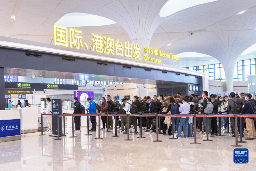 2月8日,準(zhǔn)備前往印尼巴厘島的旅客在杭州蕭山國際機場T4航站樓排隊等待。 新華社發(fā)(龍巍攝)