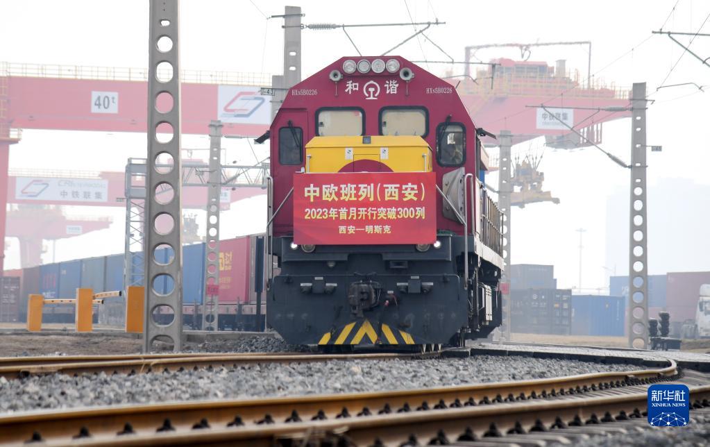 2月1日,X8151次中歐班列從西安國際港站駛出開往明斯克。 新華社記者 李一博 攝