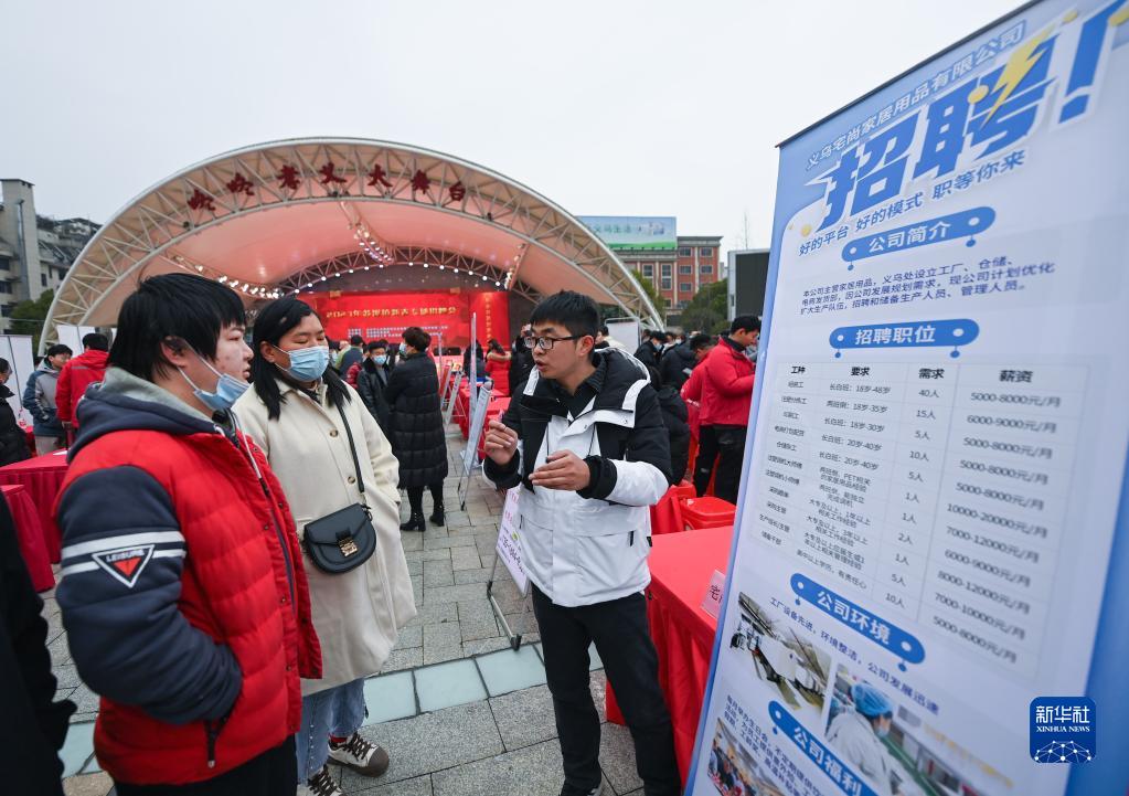 2月4日,求職者在招聘會現(xiàn)場與企業(yè)工作人員(右一)交談。當(dāng)日是立春,浙江省義烏市蘇溪鎮(zhèn)開啟“百企千崗”新春首場招聘會。 新華社記者 徐昱 攝