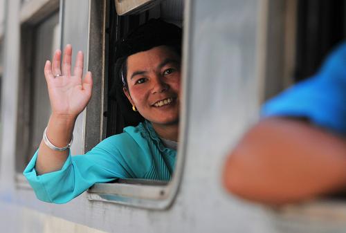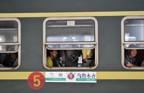 準(zhǔn)備駛離站臺(tái)的L107次采棉工專列(8月18日攝)。當(dāng)日18時(shí)10分,2013年甘肅首趟赴疆采棉工專列——L107次列車由蘭州火車站開行,來自甘肅天水、定西、臨夏等地的1600余名采棉工乘坐專列奔赴新疆務(wù)工。9月份是新疆棉花的采收季節(jié),甘肅作為進(jìn)疆采棉工的輸出地之一,每年都有大批采棉工進(jìn)疆摘棉。為保障他們順利赴疆,蘭州鐵路局蘭州客運(yùn)段抽調(diào)專門力量,自當(dāng)日起將陸續(xù)開行30趟以上的采棉工專列。新華社記者 陳斌 攝