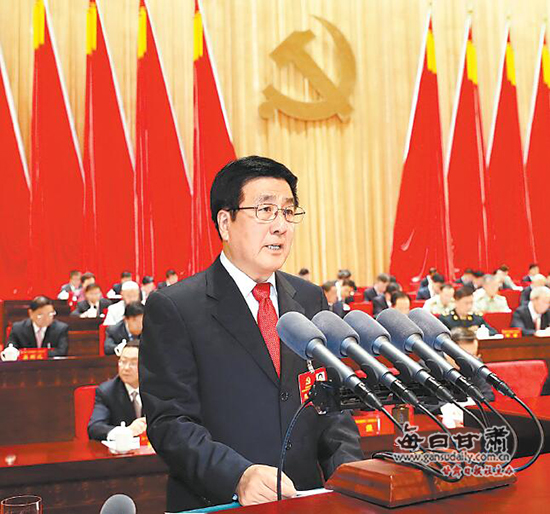林鐸在報(bào)告中指出,未來五年,是我省打贏脫貧攻堅(jiān)戰(zhàn)、全面建成小康社會(huì)的決勝階段,是全面從嚴(yán)治黨向縱深推進(jìn)的重要階段。今后五年工作的指導(dǎo)思想是:高舉中國(guó)特色社會(huì)主義偉大旗幟,堅(jiān)持以馬克思列寧主義、毛澤東思想、鄧小平理論、“三個(gè)代表”重要思想、科學(xué)發(fā)展觀為指導(dǎo),深入貫徹習(xí)近平總書記系列重要講話精神和治國(guó)理政新理念新思想新戰(zhàn)略,全面貫徹黨的十八大和十八屆三中、四中、五中、六中全會(huì)精神,深入學(xué)習(xí)貫徹黨的十九大精神,牢固樹立政治意識(shí)、大局意識(shí)、核心意識(shí)、看齊意識(shí),堅(jiān)決維護(hù)習(xí)近平總書記在黨中央和全黨的核心地位,堅(jiān)決維護(hù)以習(xí)近平同志為核心的黨中央權(quán)威和集中統(tǒng)一領(lǐng)導(dǎo),全面落實(shí)習(xí)近平總書記視察我省時(shí)的重要講話精神和“八個(gè)著力”重要指示精神,統(tǒng)籌推進(jìn)“五位一體”總體布局和協(xié)調(diào)推進(jìn)“四個(gè)全面”戰(zhàn)略布局,堅(jiān)持穩(wěn)中求進(jìn)工作總基調(diào),牢固樹立和貫徹新發(fā)展理念,適應(yīng)把握引領(lǐng)經(jīng)濟(jì)發(fā)展新常態(tài),堅(jiān)持以提高發(fā)展質(zhì)量和效益為中心,堅(jiān)持以推進(jìn)供給側(cè)結(jié)構(gòu)性改革為主線,堅(jiān)持以全面從嚴(yán)治黨為保證,解放思想、開拓創(chuàng)新,凝心聚力、真抓實(shí)干,努力同全國(guó)一道全面建成小康社會(huì),加快建設(shè)經(jīng)濟(jì)發(fā)展、山川秀美、民族團(tuán)結(jié)、社會(huì)和諧的幸福美好新甘肅。今后五年的奮斗目標(biāo)是:綜合經(jīng)濟(jì)實(shí)力、縣域經(jīng)濟(jì)發(fā)展層次、人民群眾生活質(zhì)量、法治建設(shè)能力、社會(huì)文明程度、生態(tài)建設(shè)和環(huán)境保護(hù)水平、全面從嚴(yán)治黨成效不斷提升,城鄉(xiāng)居民收入等主要經(jīng)濟(jì)指標(biāo)增速高于全國(guó)平均水平,基本公共服務(wù)達(dá)到全國(guó)平均水平,主要污染物排放和單位地區(qū)生產(chǎn)總值能耗控制在國(guó)家下達(dá)的指標(biāo)之內(nèi),現(xiàn)行標(biāo)準(zhǔn)下農(nóng)村貧困人口如期脫貧、穩(wěn)定脫貧,貧困縣全部摘帽,解決區(qū)域性整體貧困,在全面建成小康社會(huì)目標(biāo)的基礎(chǔ)上,努力實(shí)現(xiàn)更高水平的發(fā)展,在踐行習(xí)近平總書記“八個(gè)著力”重要指示精神上不斷取得新的更大成效。貫徹落實(shí)上述指導(dǎo)思想和奮斗目標(biāo),科學(xué)把握未來發(fā)展面臨的形勢(shì)和環(huán)境,有效應(yīng)對(duì)前進(jìn)道路上的風(fēng)險(xiǎn)和挑戰(zhàn),必須始終堅(jiān)持增強(qiáng)“四個(gè)意識(shí)”、保持政治定力,堅(jiān)持為民取向、踐行根本宗旨,聚焦戰(zhàn)略目標(biāo)、解決突出問題,推動(dòng)改革創(chuàng)新、激發(fā)動(dòng)力活力,勤于學(xué)思踐悟、提升素質(zhì)能力,保持進(jìn)取精神、強(qiáng)化責(zé)任擔(dān)當(dāng),注重強(qiáng)基固本、錘煉嚴(yán)實(shí)作風(fēng),講求立德修身、樹立清廉形象等八個(gè)方面的基本要求。