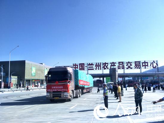 載滿特色農(nóng)產(chǎn)品的運(yùn)輸車緩緩駛出蘭州農(nóng)產(chǎn)品交易中心的大門。(高翔 攝)