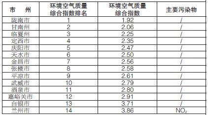 9月份,全省14個城市環(huán)境空氣質(zhì)量綜合排名由好到差分別為隴南、甘南、臨夏、定西、慶陽、天水、金昌、張掖、平?jīng)觥⑽渫⒕迫、嘉峪關(guān)、白銀、蘭州。