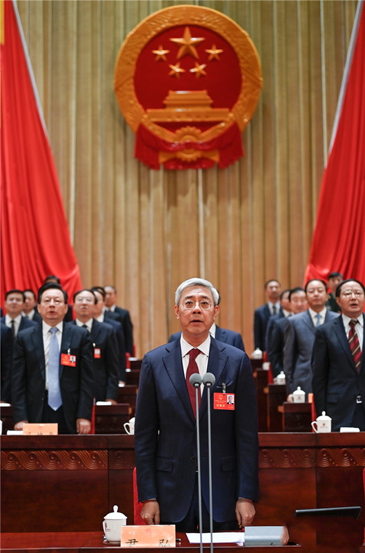 上午9時,尹弘宣布:甘肅省第十三屆人民代表大會第五次會議開幕。全體起立,高唱國歌。