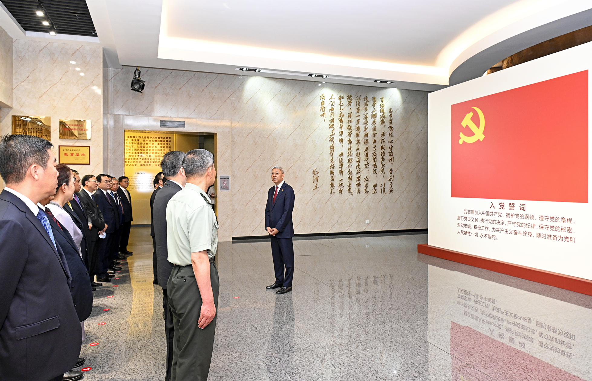 參觀結(jié)束后,尹弘、任振鶴等來到紀(jì)念館序廳。面向鮮紅的中國共產(chǎn)黨黨旗,尹弘舉起右拳,帶領(lǐng)黨員領(lǐng)導(dǎo)同志重溫入黨誓詞:“我志愿加入中國共產(chǎn)黨,擁護(hù)黨的綱領(lǐng),遵守黨的章程,履行黨員義務(wù),執(zhí)行黨的決定,嚴(yán)守黨的紀(jì)律,保守黨的秘密,對黨忠誠,積極工作,為共產(chǎn)主義奮斗終身,隨時準(zhǔn)備為黨和人民犧牲一切,永不叛黨!辩H鏘有力的誓言響徹大廳。