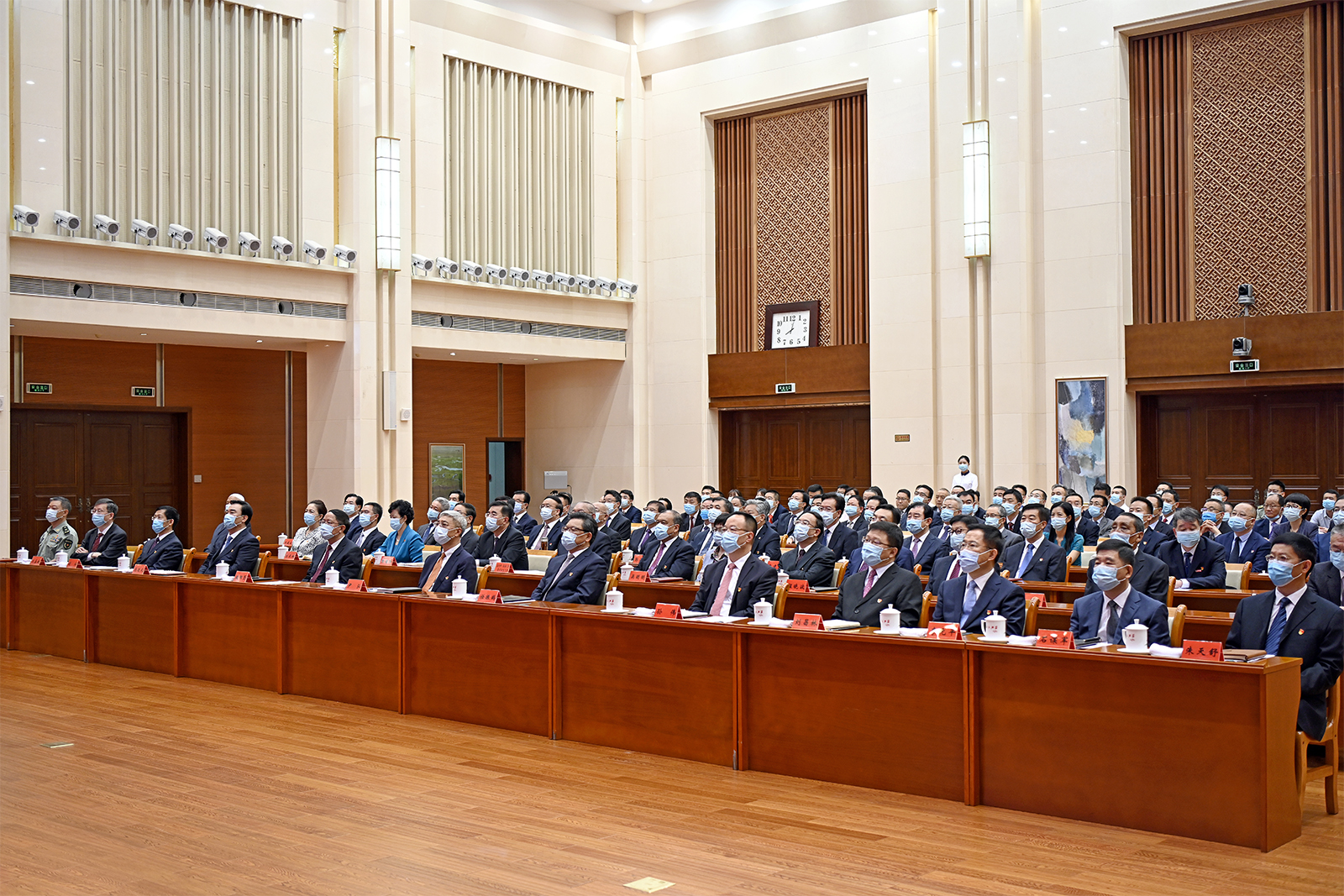 7時53分許,在歡快的樂曲聲中,習(xí)近平等黨和國家領(lǐng)導(dǎo)人來到天安門城樓主席臺,會場爆發(fā)出熱烈的掌聲。8時整,慶祝大會開始,中國人民解放軍聯(lián)合軍樂團(tuán)奏響雄壯的《義勇軍進(jìn)行曲》,尹弘、任振鶴等全體起立,隨北京現(xiàn)場一起高唱中華人民共和國國歌,目視大屏幕里鮮艷奪目的五星紅旗冉冉升起,在天安門廣場上空迎風(fēng)飄揚(yáng)。在熱烈的掌聲中,習(xí)近平總書記發(fā)表重要講話,大家認(rèn)真聆聽、專心筆記,第一時間深刻學(xué)習(xí)領(lǐng)會,不時報以熱烈的掌聲。