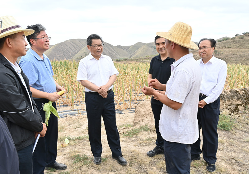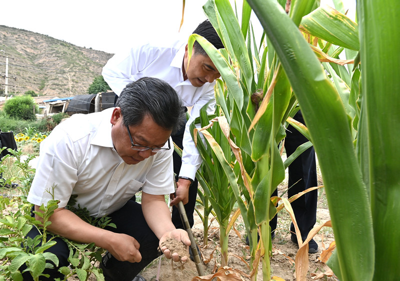 在定西市安定區(qū)巉口鎮(zhèn)磨石溝村、魯家溝鎮(zhèn)山灣村、白碌鄉(xiāng)復(fù)興村和白銀市會寧縣漢家岔鎮(zhèn)細(xì)岔村、柴家門鎮(zhèn)樊郭村,任振鶴進(jìn)山區(qū)、上塬面、走村落,不時停車深入田間地頭,翻開土壤察看苗情墑情,與村民和農(nóng)技人員交談交流,共同商討研究抗旱減災(zāi)措施。他指出,7月中旬以來,我省持續(xù)高溫少雨,部分地區(qū)旱情嚴(yán)重。相關(guān)地區(qū)和部門要迅速行動起來,克服“等靠要”、打好主動仗,力量沉到一線、措施上到地頭,因地制宜、科學(xué)組織,上下聯(lián)動、合力抗旱,盡最大努力減輕干旱造成的影響。