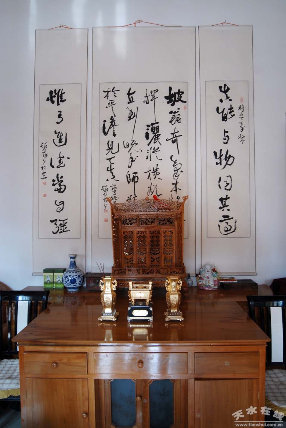 走進(jìn)“書(shū)畫(huà)之鄉(xiāng)”甘谷縣大石鄉(xiāng),雨后的空氣里飄散著一股淡淡的墨香,在這里,你會(huì)深切地感到一種撲面而來(lái)的文化氣息,這種文化談不上博大而精深,但執(zhí)著而堅(jiān)韌。隨便走進(jìn)一戶農(nóng)家,客廳的廈房里,絕對(duì)會(huì)有一堂字畫(huà),半軸山水,裝裱后精氣神兒十足地懸在墻上,李澤廣、左宗棠、安維俊等名家的墨寶也不乏其中。除了收藏,農(nóng)閑時(shí)節(jié),大石農(nóng)民書(shū)畫(huà)愛(ài)好聚集在一起,揮毫潑墨!凹矣凶之(huà)不算窮,翰墨飄香樂(lè)融融”是對(duì)“書(shū)畫(huà)之鄉(xiāng)”的真實(shí)寫(xiě)照!
