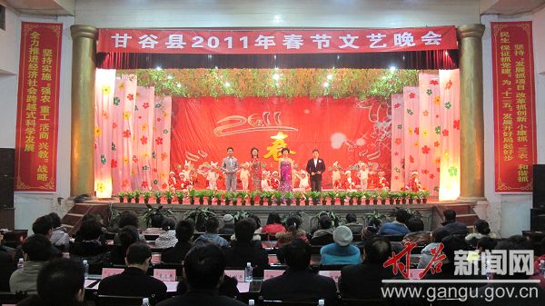 1月26日晚,甘谷縣2011年春節(jié)聯(lián)歡晚會(huì)在縣委禮堂隆重上演。縣委書(shū)記溫利平,縣人大常委會(huì)主任衡彬,縣委副書(shū)記、縣長(zhǎng)賈忠慧,縣政協(xié)主席王璽卿等縣四大組織在家領(lǐng)導(dǎo)與廣大干部群眾歡聚一堂,觀看演出,共慶新春佳節(jié)。