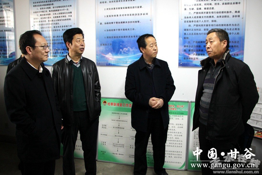 12月7日,天水市檢察院副檢察長李春熙、市直機關(guān)工委副書記魏國柱、市檢察院預防處處長王驊一行深入甘谷縣檢查“兩好兩促”和“庸懶散軟”專項整治工作?h委副書記武建成,縣檢察院檢察長高保德及相關(guān)部門負責人陪同。