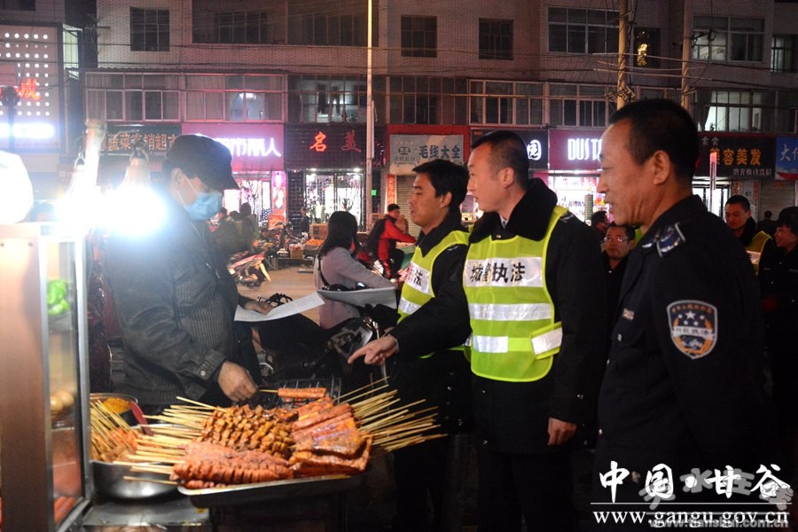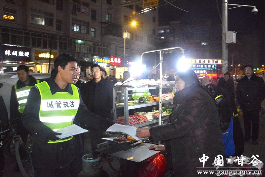 為進一步規(guī)范夜市經(jīng)營行為,改善城市人居環(huán)境,11月25日晚,甘谷縣環(huán)境整治辦聯(lián)合縣綜合執(zhí)法局、公安局、食藥監(jiān)局、工商局、環(huán)保局等相關(guān)部門,抽調(diào)30多名執(zhí)法人員,聯(lián)合開展夜市攤點整治行動,集中治理夜間攤點占道經(jīng)營、環(huán)境污染、噪音擾民等夜市亂象。