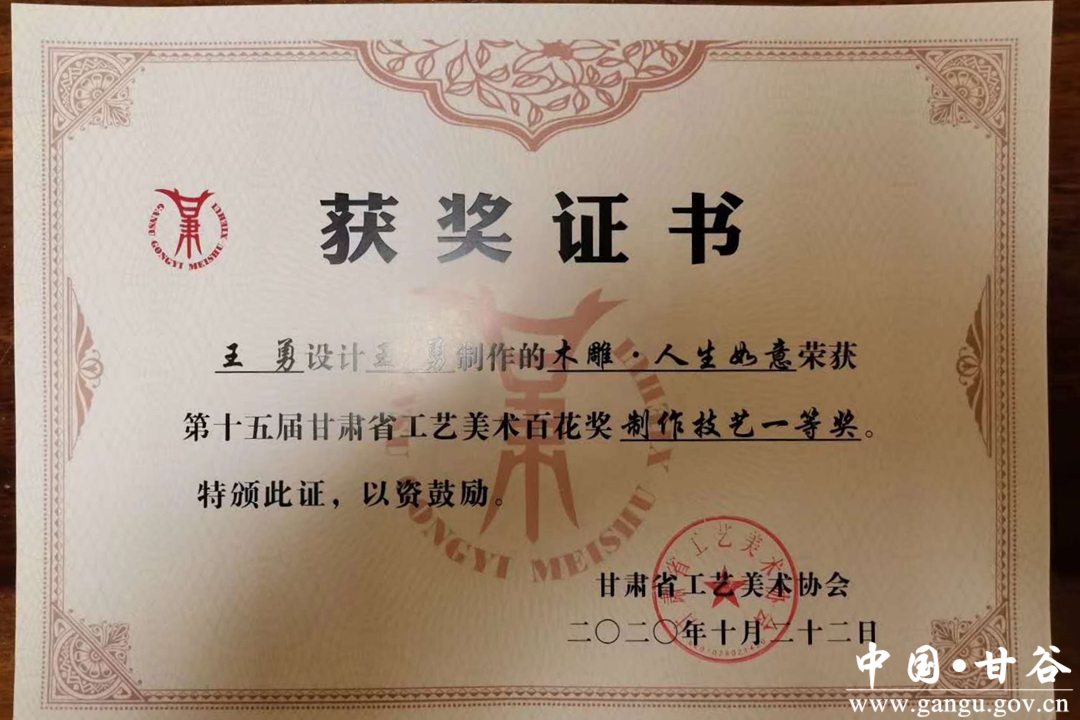 10月25日,2020甘肅省工藝美術(shù)作品展暨第十五屆甘肅省工藝美術(shù)“百花獎”評選結(jié)果揭曉,其中,甘谷縣王勇設(shè)計和制作的木雕作品《人生如意》榮獲2020年甘肅省工藝美術(shù)協(xié)會辦法的百花獎制作技藝一等獎,王勇設(shè)計王勇和王勝鵬制作的木雕作品《大象山》榮獲百花獎創(chuàng)作創(chuàng)新二等獎。