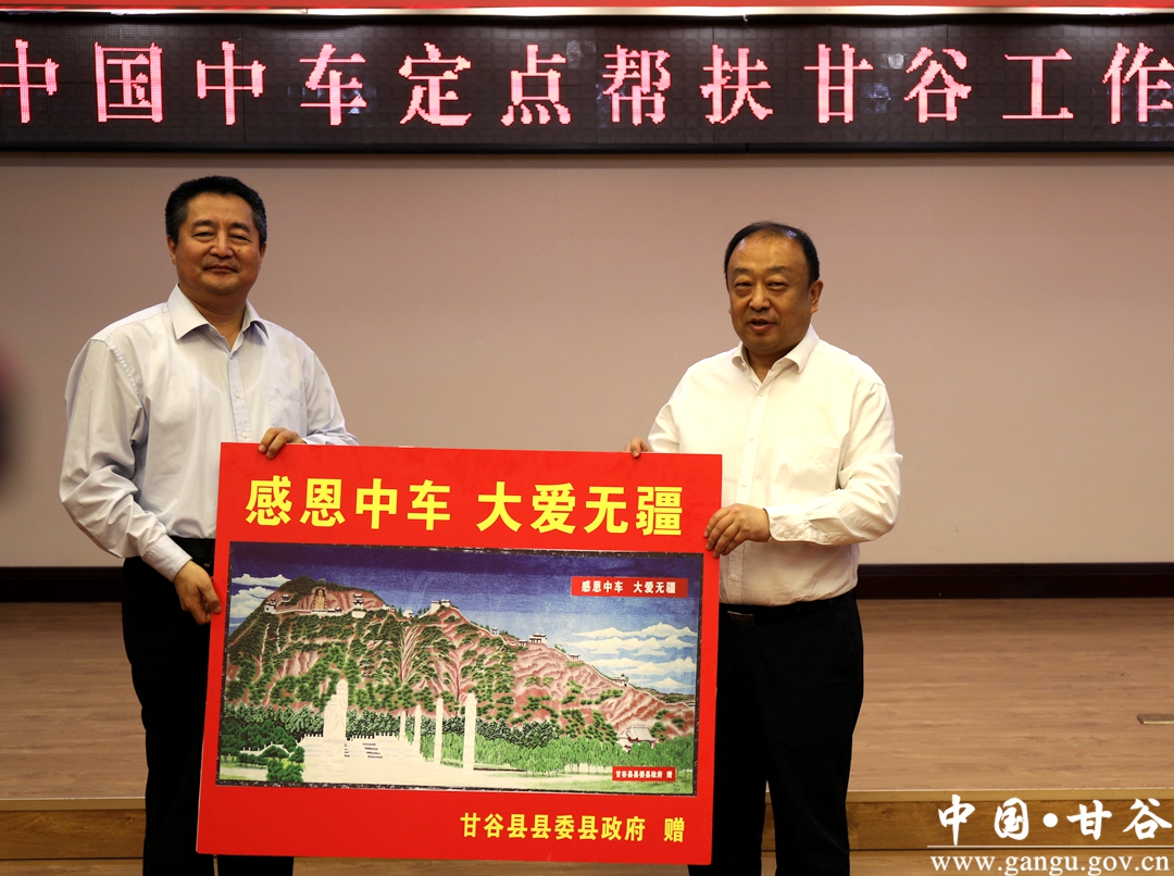在召開的中國中車定點幫扶甘谷座談會上,縣委副書記、縣長吳健匯報了中車集團(tuán)幫扶甘谷縣工作情況,副縣長李蘭平、縣政府黨組成員龐新志進(jìn)行了發(fā)言,中車集團(tuán)向甘谷捐贈了50萬元幫扶資金,甘谷縣向中車集團(tuán)回贈了騰達(dá)扶貧車間制作的掛毯禮品。