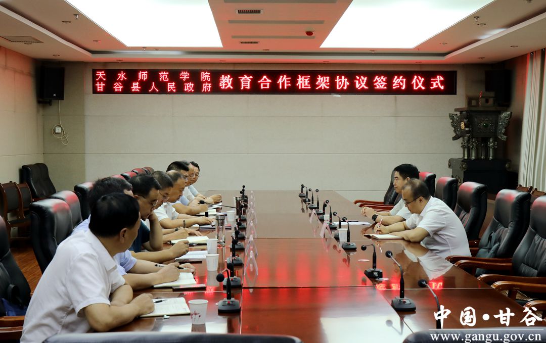 7月16日,天水師范學(xué)院與甘谷縣人民政府教育合作框架協(xié)議簽約儀式舉行。天水師范學(xué)院黨委常委、副校長汪聚應(yīng)和甘谷縣人民政府副縣長牛武軍分別代表天水師范學(xué)院、甘谷縣人民政府簽訂了《教育合作框架協(xié)議》?h委副書記、縣長吳健出席簽約儀式并致辭;縣委副書記舒時光主持簽約儀式;縣政府辦、教育、人社、財政等相關(guān)部門負(fù)責(zé)人參加會議。