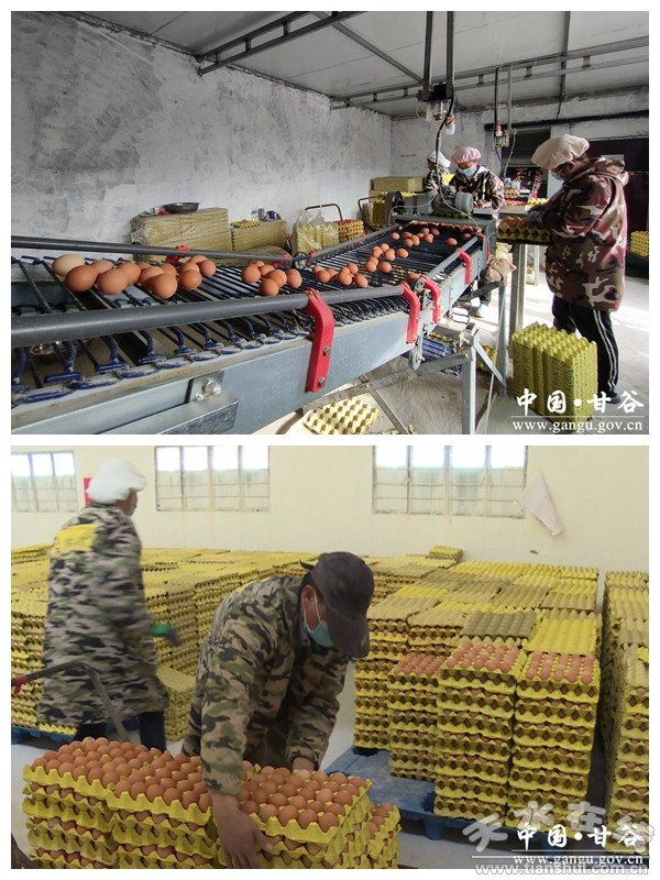 記者來(lái)到甘谷豐裕蛋雞養(yǎng)殖場(chǎng)時(shí),正趕上工人收雞蛋。蛋架上一枚枚雞蛋通過(guò)傳送帶送到撿裝臺(tái),工人們正在快速撿蛋裝盤(pán)。雞場(chǎng)上料、撿蛋等都實(shí)現(xiàn)了機(jī)械化,糞污采用有機(jī)發(fā)酵塔全部做成有機(jī)肥,直接銷(xiāo)往周邊農(nóng)戶(hù)。