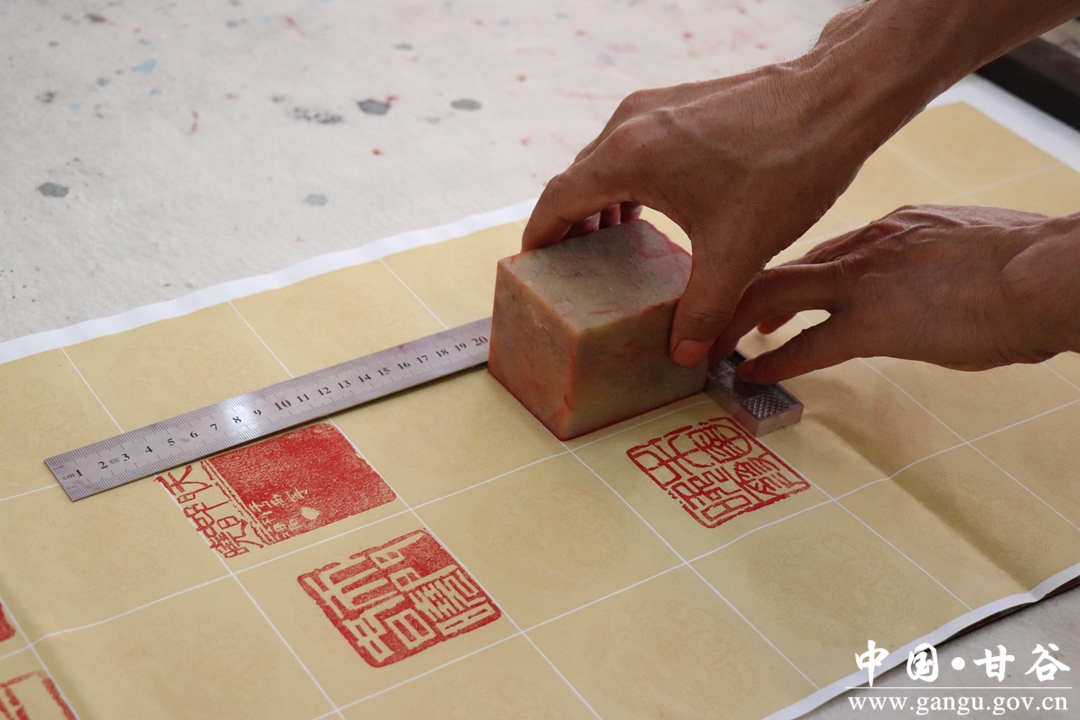 篆刻藝術(shù)是集書法和鐫刻來制作印章的獨特藝術(shù),是漢字特有的藝術(shù)形式。在創(chuàng)作書案上,八枚古樸典雅、刀工精致的青田石印規(guī)整排列,篆刻家用印規(guī)在宣紙上確定鈐蓋位置,以及其熟練地手法蘸印泥、蓋印花、拓邊款、題簽條。