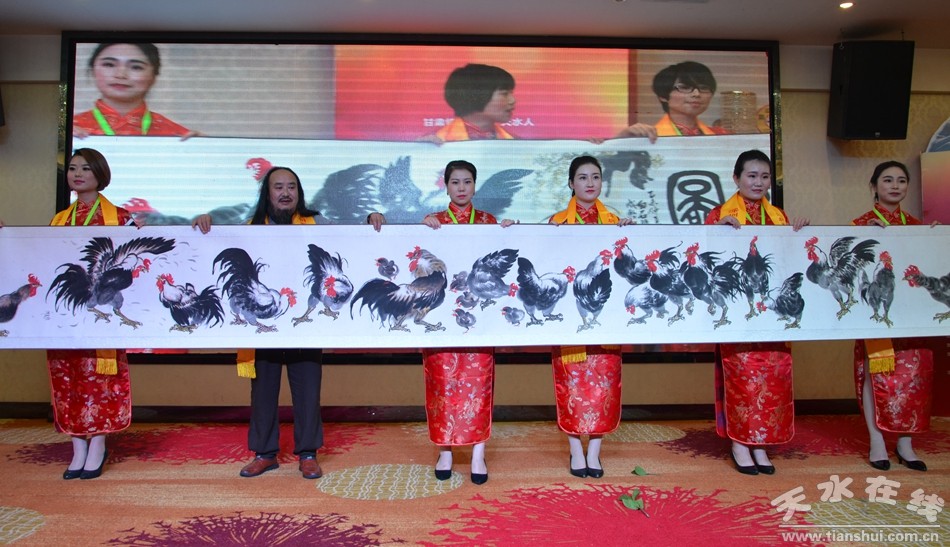 (天水書法家、剪紙藝人成熙斌向深圳天水同鄉(xiāng)會贈送百雞圖。)