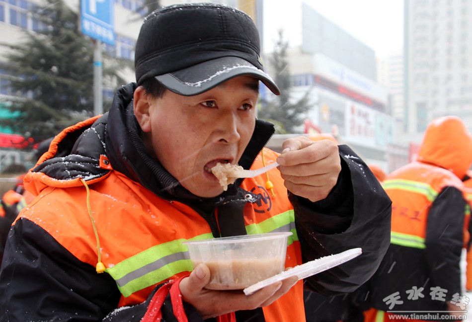 (“一碗臘八粥 溫暖一座城”——秦州區(qū)“弘揚(yáng)傳統(tǒng)文化 關(guān)愛環(huán)衛(wèi)工人”送溫暖活動(dòng)在龍城廣場(chǎng)等地舉行。)