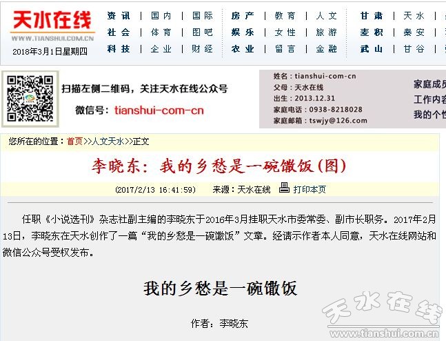 近日,掛職天水市委常委、副市長的李曉東同志,掛職二年期滿。掛職期間,李曉東同志寫下了《我的鄉(xiāng)愁是一碗馓飯》,從“伏羲廟會”等天水傳統(tǒng)文化寫起,先后又創(chuàng)作了《天水市政府是四層的筒子樓》《天水,我的望鄉(xiāng)崖》《中梁山記》《桃之夭夭》《呱呱》《核桃青青》《煙火人間》《萬象天水石》《五彩天水》《花牛鮮紅》《古屋新面》《紅源訪蹤》《卦臺謁祖》等,以《雪落天水,第一炷香祭伏羲》又收筆于伏羲廟,共創(chuàng)作了十五篇宣傳推介天水歷史文化的文學(xué)作品,對提升天水的知名度和影響力作出了貢獻。