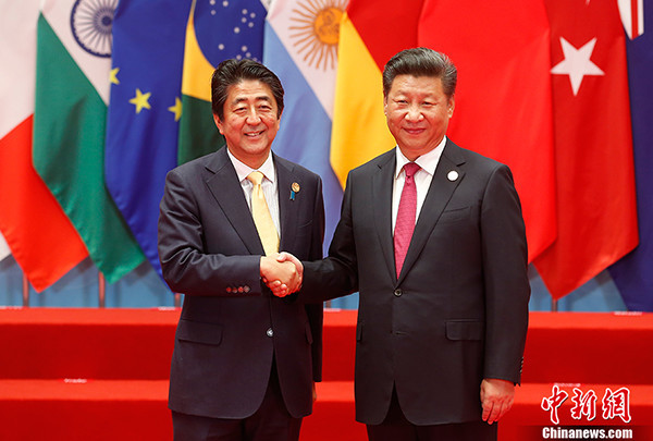 二十國集團領導人第十一次峰會在杭州國際博覽中心舉行,習近平同日本首相安倍晉三握手