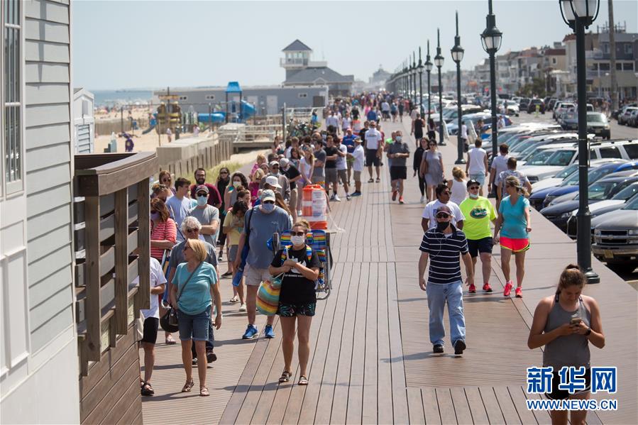 5月16日,人們?cè)诿绹?guó)新澤西州貝爾馬海灘的棧道上排隊(duì)等待購(gòu)買海灘季票。 新華社發(fā)(郭克攝)
