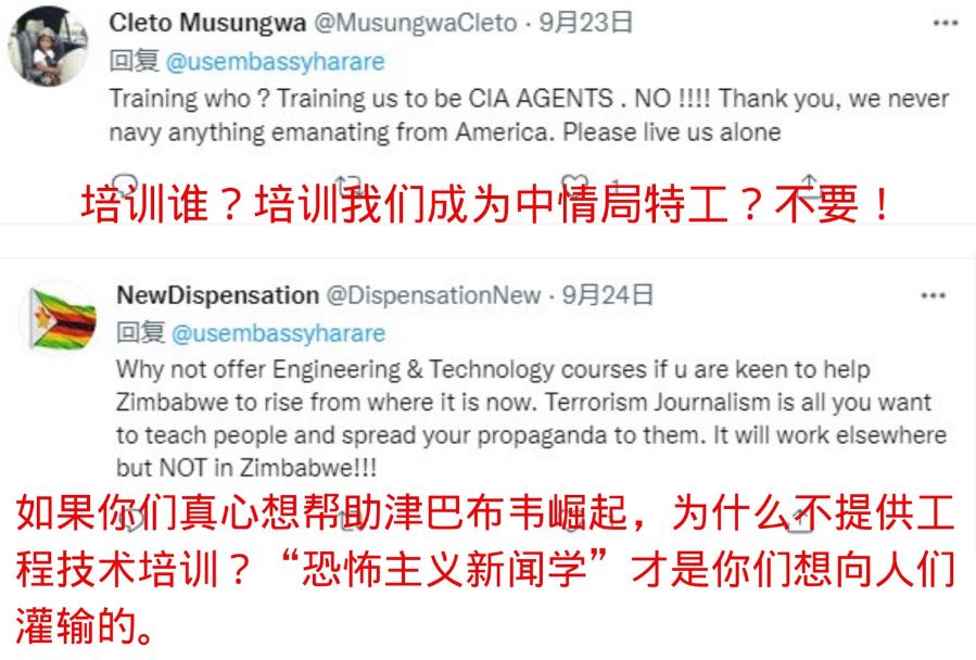 有網(wǎng)友在美駐津使館推特賬號下留言說,美國對當(dāng)?shù)孛襟w的所謂培訓(xùn)是“為中央情報局找線人”;還有網(wǎng)友認(rèn)為,美國如果是出于真心,應(yīng)該為津巴布韋提供工程技術(shù)培訓(xùn),而不是出資灌輸和宣傳美國的“恐怖主義新聞學(xué)”。
