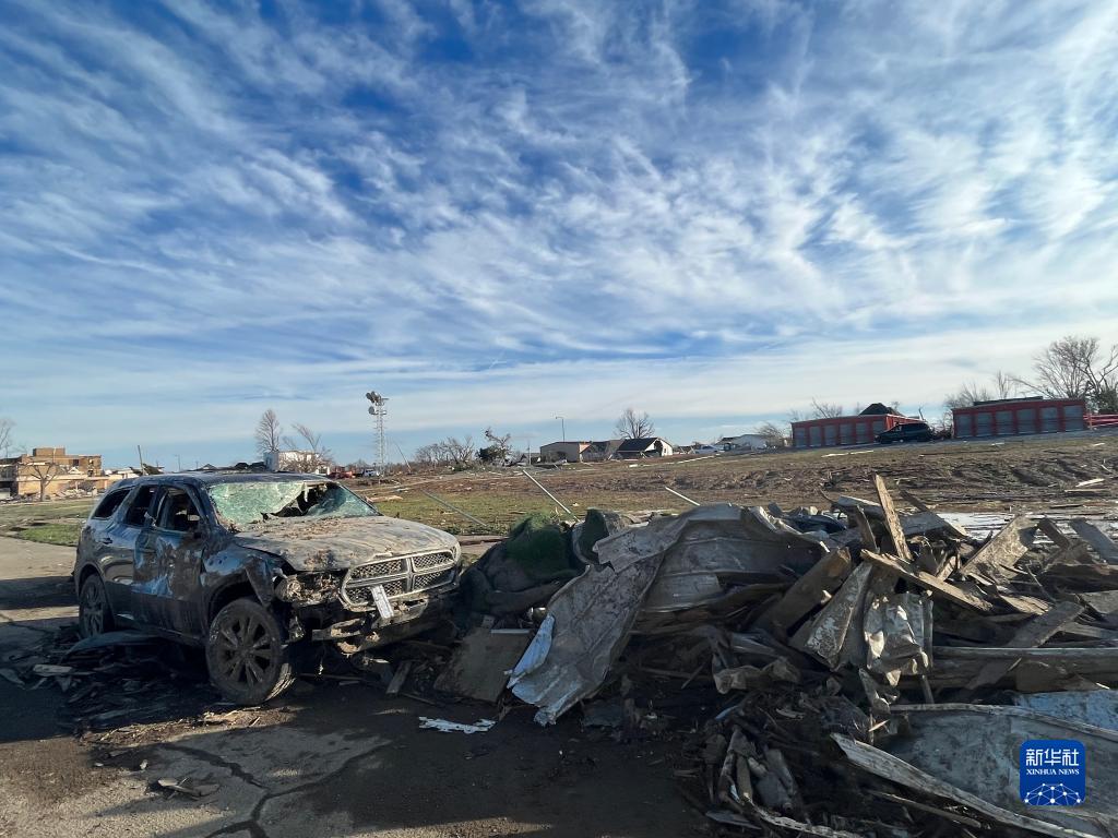 12月11日,在美國肯塔基州梅菲爾德,一輛汽車在龍卷風(fēng)襲擊中損毀。新華社發(fā)(卡蘿蜜娜·桑切斯攝)