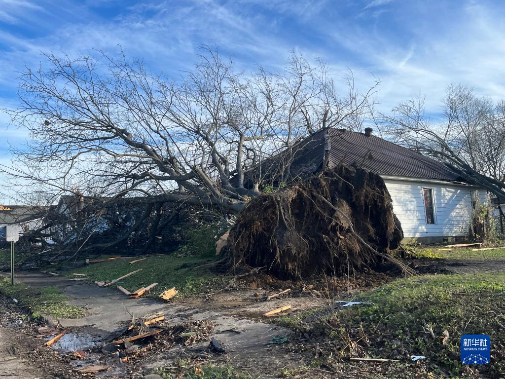 12月11日,在美國肯塔基州梅菲爾德,一棵大樹被龍卷風(fēng)連根拔起。新華社發(fā)(卡蘿蜜娜·桑切斯攝)